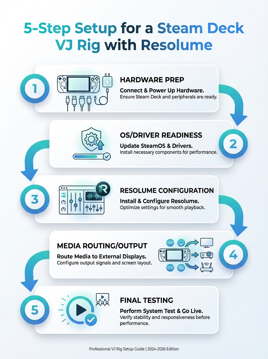 This infographic walks you through a 5-step setup to turn a Steam Deck into a portable VJ rig with Resolume. From hardware connections to performance workflow, it’s your quick reference for live visuals.