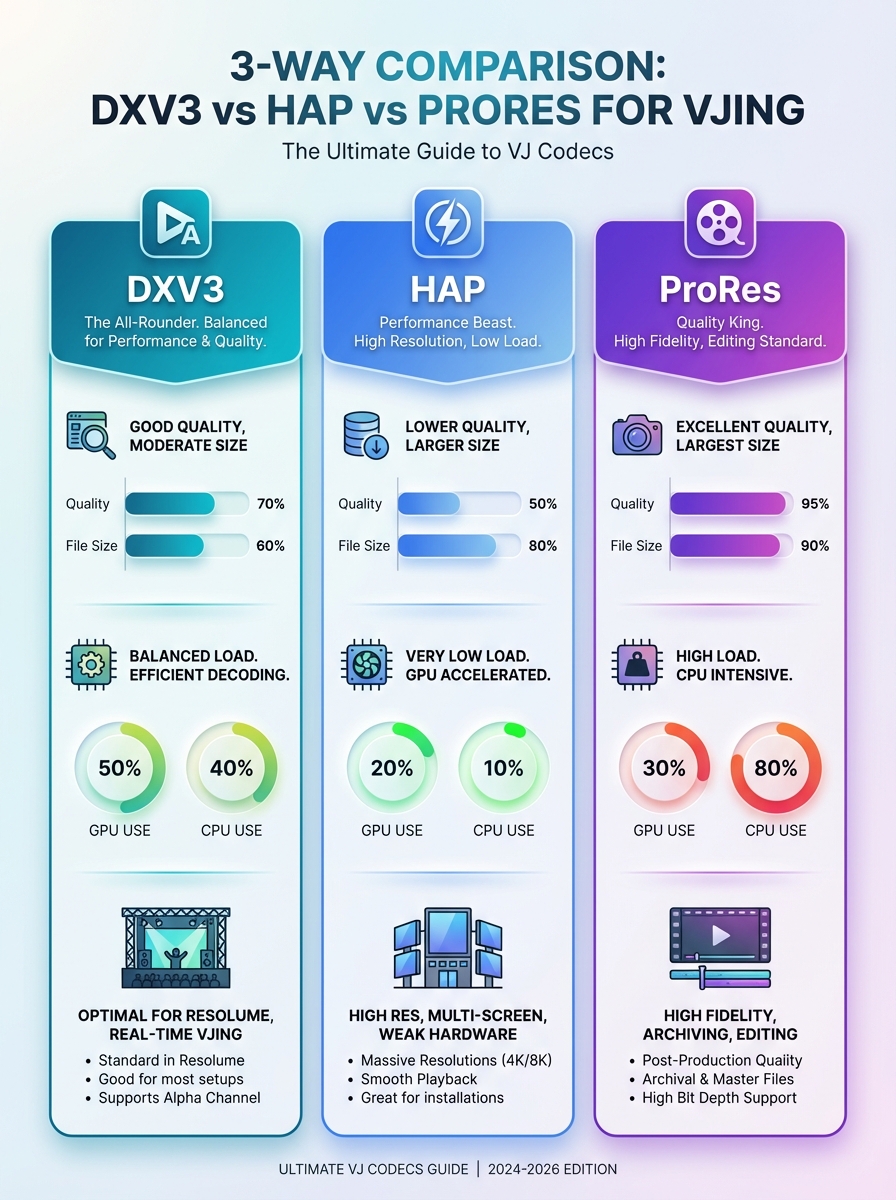 This infographic compares DXV3, HAP, and ProRes codecs for VJing. It highlights quality, performance, and workflow trade-offs at a glance.